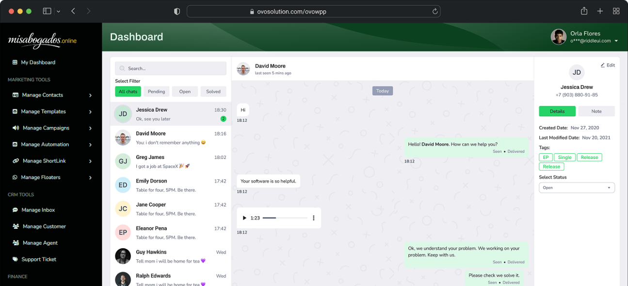 MisAbogados.online is a complete cross-platform WhatsApp CRM and marketing tool that helps businesses manage conversations, automate customer engagement, and run marketing campaigns through WhatsApp.